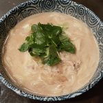 きね打ち麺の様な透明なうどんで、手繰ると全体的に少し短い。