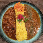 左がサグチキンカレー、右がスリランカビーフカレーで手前にはダル、奥にはアチャール、サンボルなどの副菜が添えられていて見た目にも美しい。ライスはインディカ米とジャポニカ米のミックスでスパイスに漬けたうずらの卵が鎮座する。
