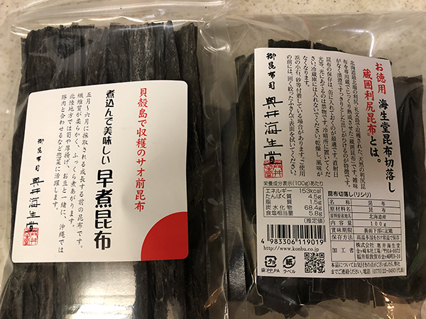 右側の利尻昆布の切り落としはコスパが高くておすすめだ。左側の昆布は出汁ではなく食べる用の昆布で、簡単で驚くほど柔らかくて美味しいとの事でおすすめされ、初挑戦。これからの鍋の季節が楽しみだ。