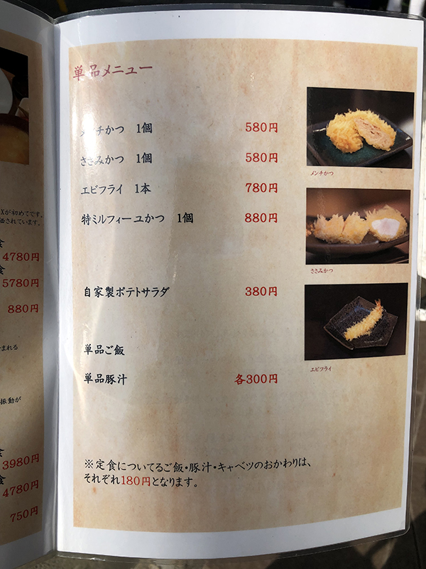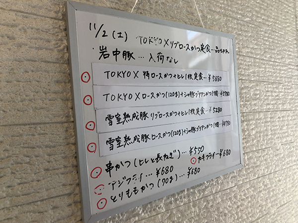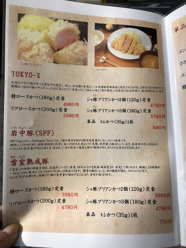 列の最後尾に加わるとものの数分で店員さんがメニューを持ってやってきた。これ以外にも待機場の壁に掲げられたホワイトボードにはこの日にあるもの、ないものが書かれていると言うので、まずはそちらを確認。岩中豚はないものの、TOKYO Xや雪室熟成豚は大丈夫そうだ。愛農ナチュラルポークもない様子。