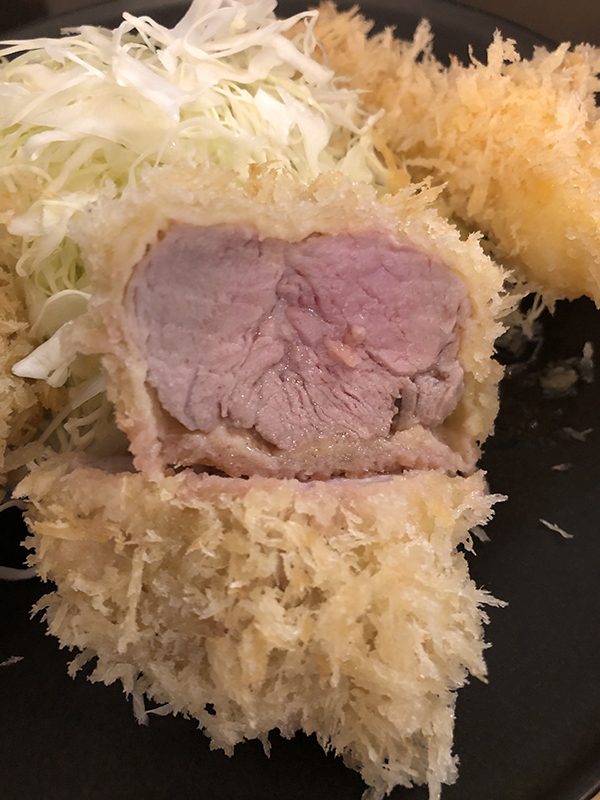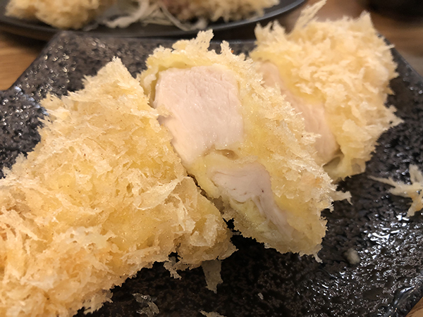 まずは味が淡泊なささみかつから。ささみとしてはかなりの大ぶりで立派なもの。的確な火入れでジューシーな仕上がり。ささみがここまでしっとりしているのには正直驚いた。ただ、低温で揚げているためか、衣にわずかに残った油が少し気になった。