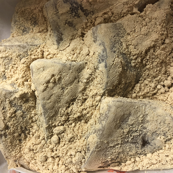 箱を開けると大量のきな粉に覆われた九十九餅が所狭しと並ぶ。