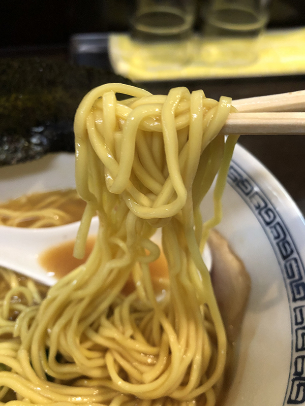 麺は灌水が多めなのか、黄色味がかった、平打ちの中細タイプ。