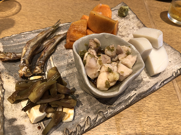 柿酢、板わさ、もも焼き、茎わさびの漬物クリームチーズ添え、焼きししゃもと言う内容。