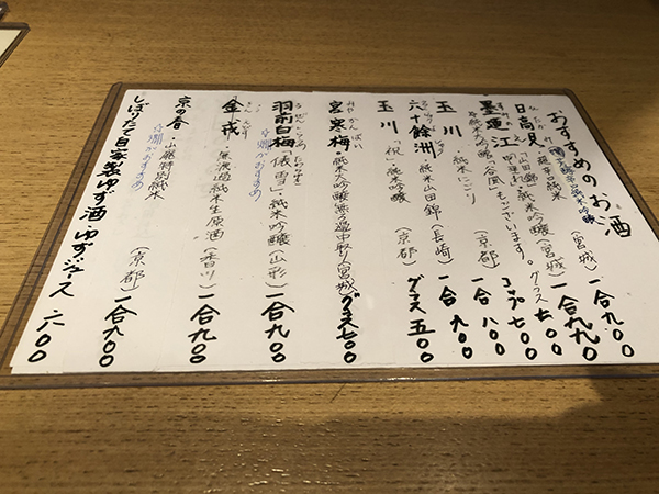 酒肴がなかなかの充実ぶり。定番メニューの他に、季節の品々も用意されている。