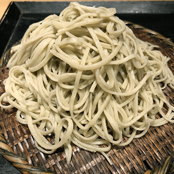 北海道産のそば粉を使った十割蕎麦はやや緑掛かった色彩を帯びている。