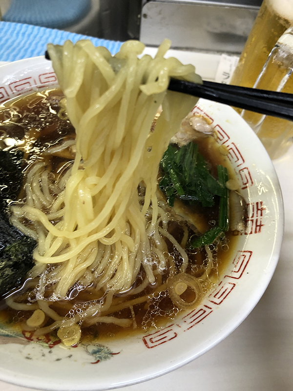ひと口すするとバランスが取れた醤油味のスープに生姜の香りが絡む。見た目ほど濃い印象は受けない。