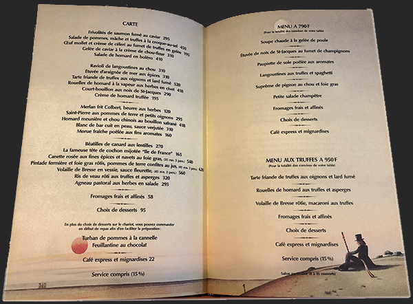これを見て思い出した事がある。故ジョエル・ロブション氏が全盛期のジャマンで使っていたメニューだ。