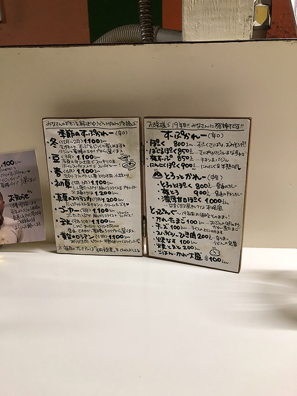 メニューはスープカレーととろっとカレーに分かれ、季節ごとのメニューも用意されている。