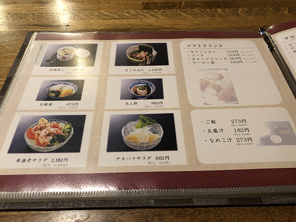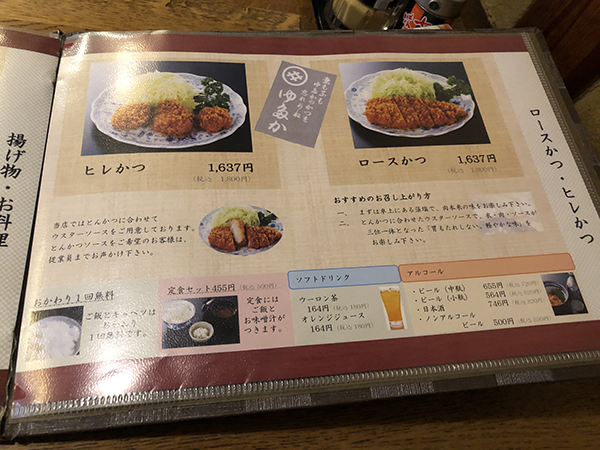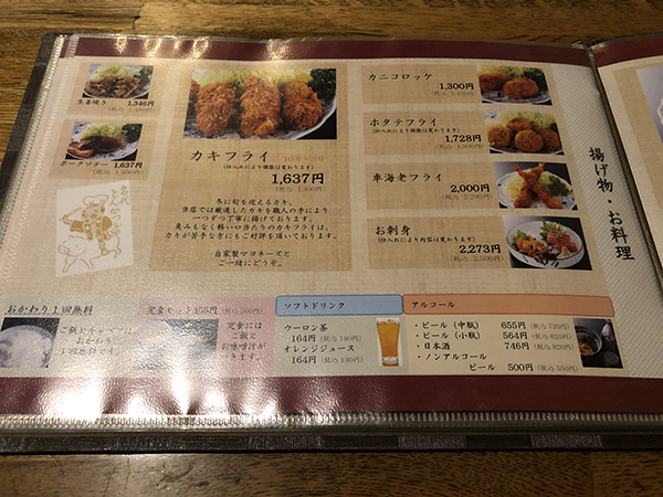 とんかつが看板ではあるが、所謂、専門店ではないので、カキフライや、車海老フライなどの揚げ物から生姜焼きまで、メニューは多岐にわたる。