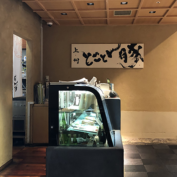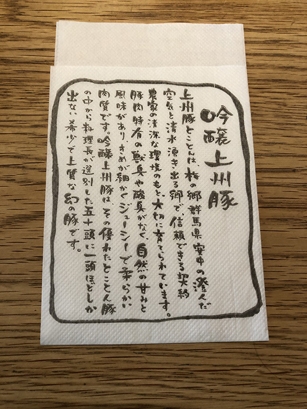 ロースとヒレの他に、かつ煮風のロースかつ鍋膳やかつカレー、とんかつ茶漬けなどバリエーション豊富なとんかつメニューが並ぶ。そのとんかつの主役は吟醸上州豚。紙ナプキンにそのうんちくが記されている。