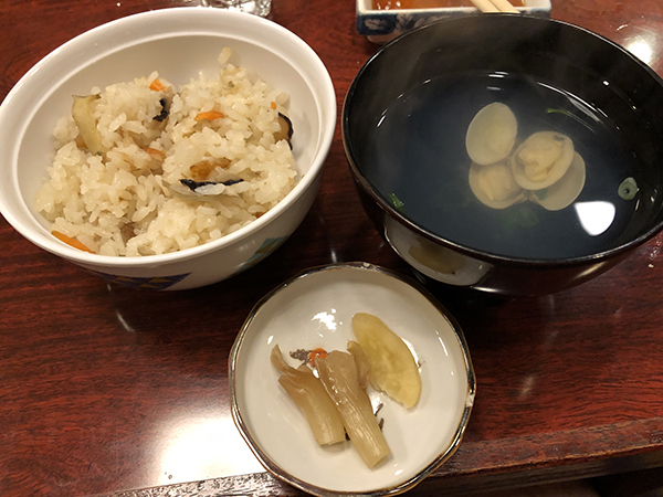締めは貝の出汁で炊き込んだご飯にお吸い物。