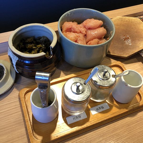 卓上に置かれた食べ放題の明太子と高菜。実に嬉しいサービスではある。