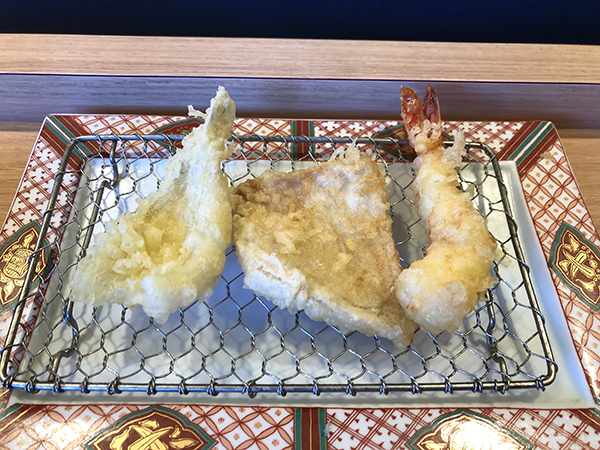 メインの魚と肉は左からきす、豚肉、海老の順。