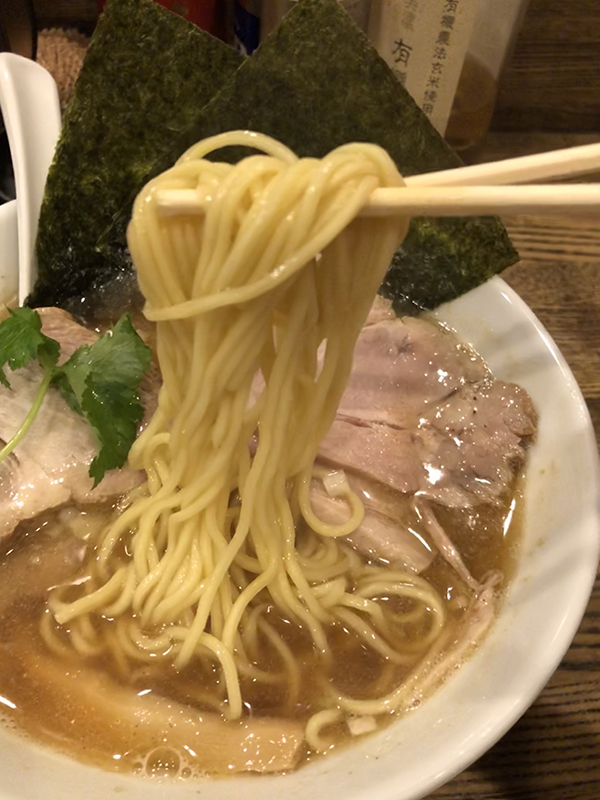 麺は白味を帯びた中細タイプ。低加水でコシは強くないものの、スープがよく絡みバランスがいい。