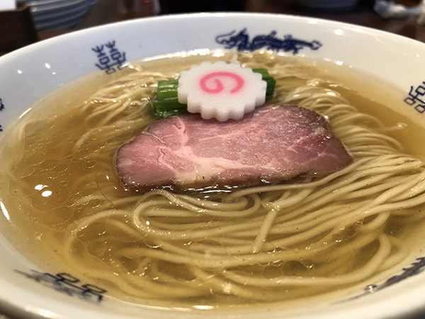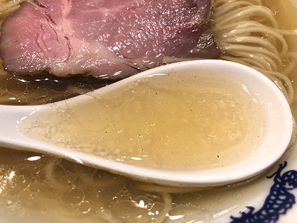 スープは一見、塩ラーメンかと思うほど、醤油の色彩が薄く、黄金色に近い。まずはそのスープを頂くとまず煮干の香りが立ち込める。その香りは強すぎることなく、実にいい塩梅に収まっている。