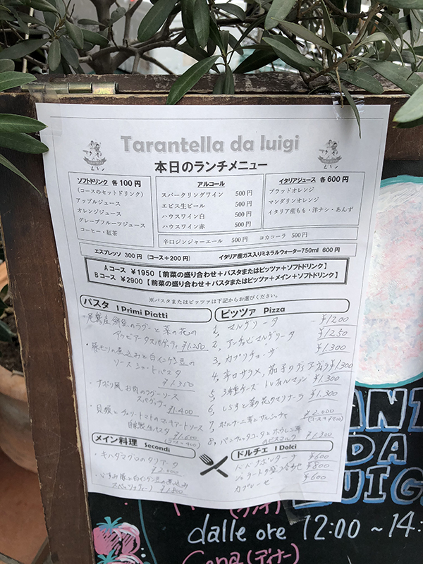 ランチタイムのメニューを見るとパスタかピッツァのどちらかを選択するスタイル。各々、選択肢は多い。