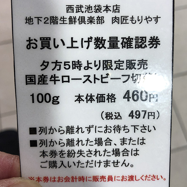 これくらいの間隔があれば、なかなか来る機会もないので最後尾に。するとその時点で何グラム購入するかを聞かれ、引換券を手渡された。並ぶ段階で数量を管理しているようだ。