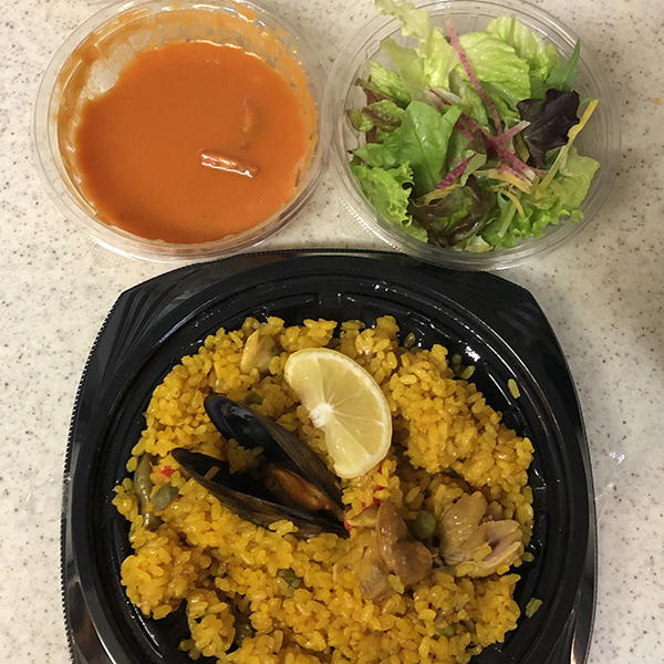 購入したのはこちらの3品。パエリアとサラダとガスパチョ。