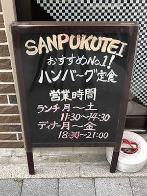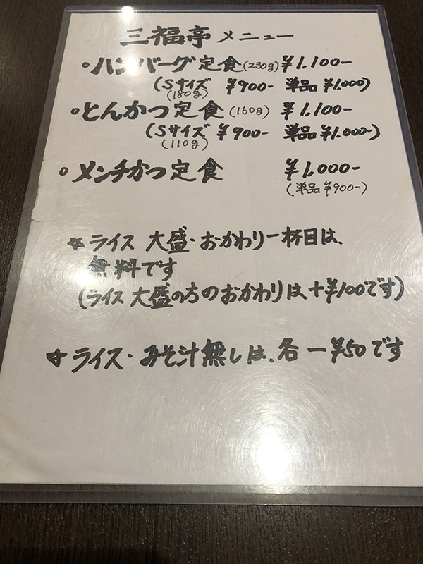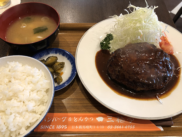 基本的にハンバーグ、メンチ、とんかつ、カレーとそのバリエーションで、意外にもとんかつを注文しているお客さんが多い。ここは230gのハンバーグ定食を注文。