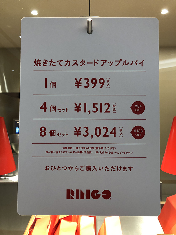池袋や日比谷のミッドタウンにもあるアップルパイの専門店。これらの店舗では行列が出来るほど人気が高い。オープン初日こそ行列が出来ていましたが、誰もいなかったのですんなりと購入できました。
