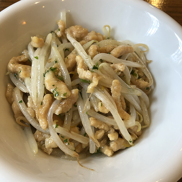 細切りの豚肉は油通しされた後にもやしと共に。パクチーの存在感が予想外。