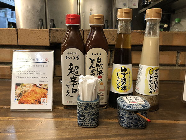 カウンターに置かれた調味料類。ソースとドレッシングはともに2種類。