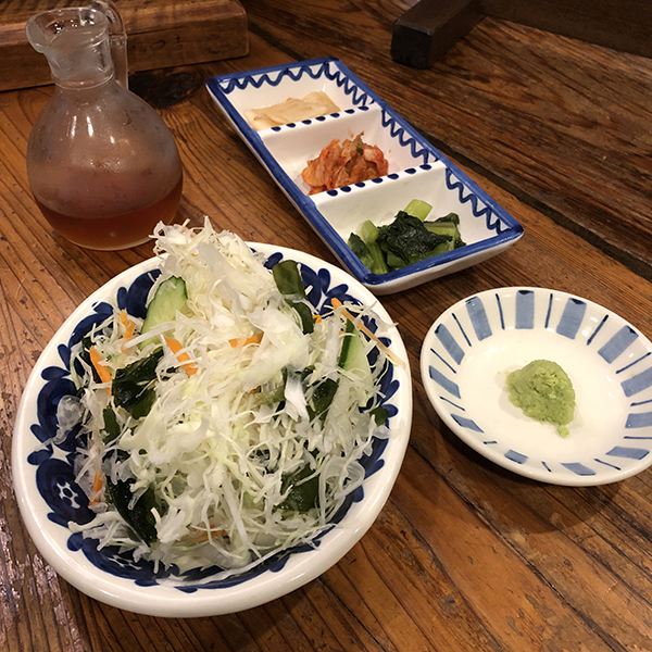 席につくとお漬物と味変用のわさび、サラダが供された。