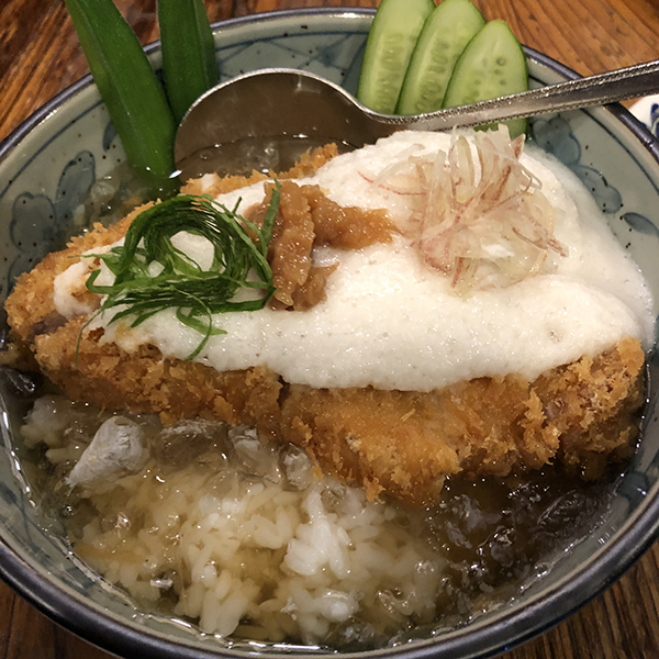 メニューの説明によると醤油ベースのかつお出汁に夏野菜と「とろろ」で仕上げたかつ丼とある。