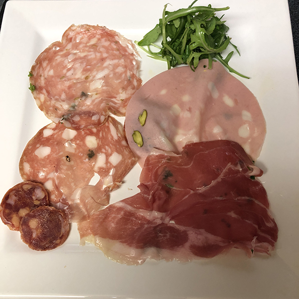 この写真で全体の2/5ほどの分量となるので結構、盛りだくさん。パルマ産生ハムから唐辛子が入ったサラミまでバラエティに富んだラインナップ。ソーセージの他にルッコラも入る。