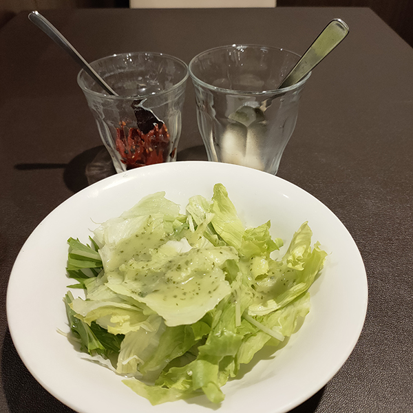 薬味の福神漬け、らっきょうと共にサラダが運ばれてきた。グラスに入った薬味とは変わっているが、かえって効率的なのだろう。