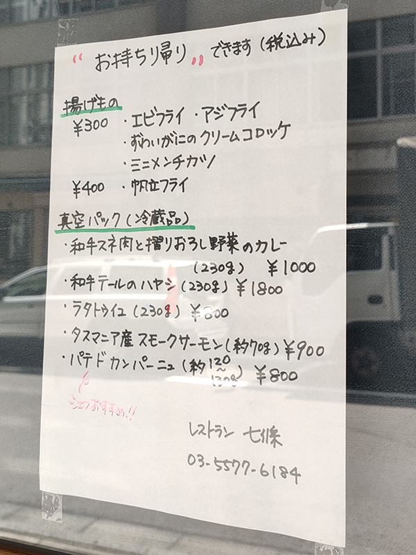 いまのご時世だけあって、各種テイクアウトも行っている様子。