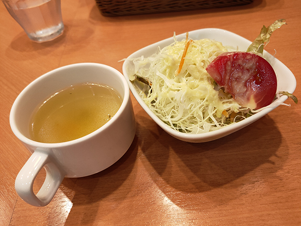 注文をしてほどなくすると、スープとサラダが運ばれてきた。一見、何の変哲もないサラダだが、フォークを刺した瞬間、ふわっとした柔らかいクッション性にビックリ。