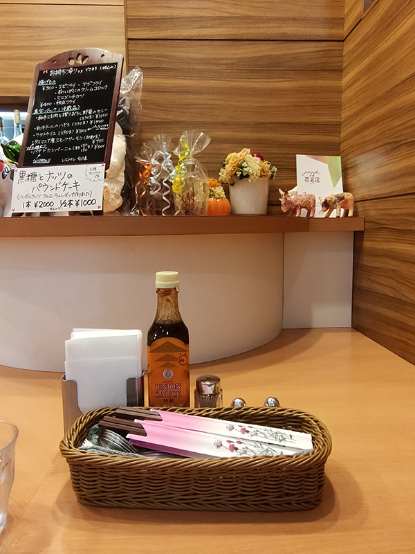 カウンターの棚には調度品が整然と並べられている。そして、テーブルで目についたのがユニオンソースだ。東京の根津で作られているソースで我が家でも愛用している。