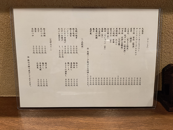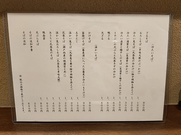 おそばのメニューは少数精鋭ながら冷たい葱そばなど興味深い品が並ぶ。