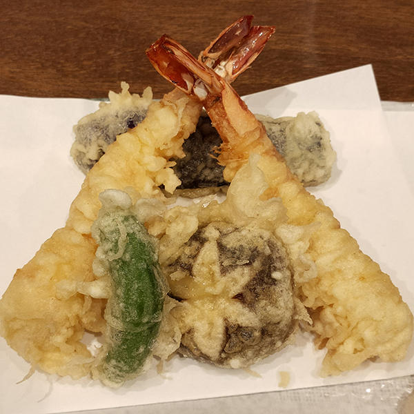 天ぷらはイチヂクに比べると衣が厚め。海老が2尾に、ししとう、椎茸、なすと言うラインナップ。別に天つゆを出してくれるところがいい。