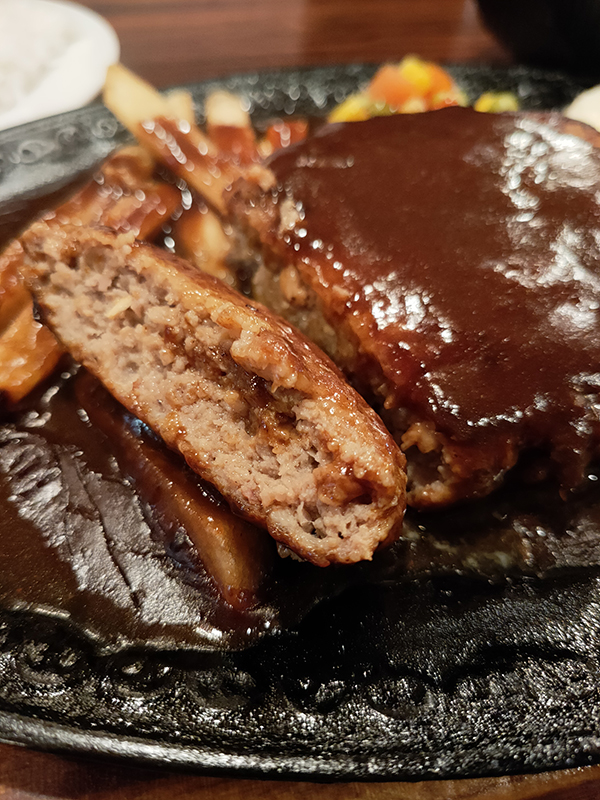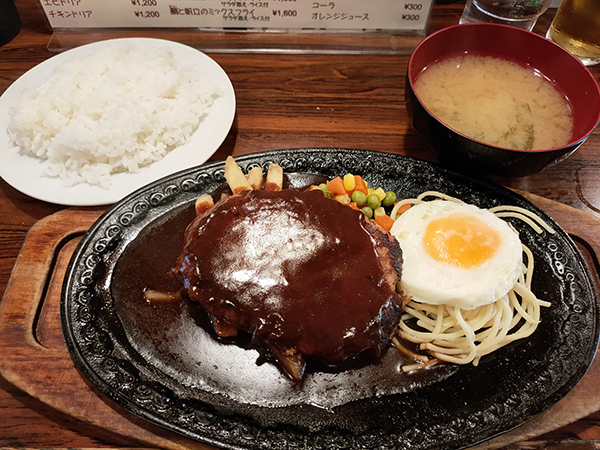 150gのハンバーグは鉄板で供される。洋食屋ではあるがスープではなく味噌汁というところが面白い。