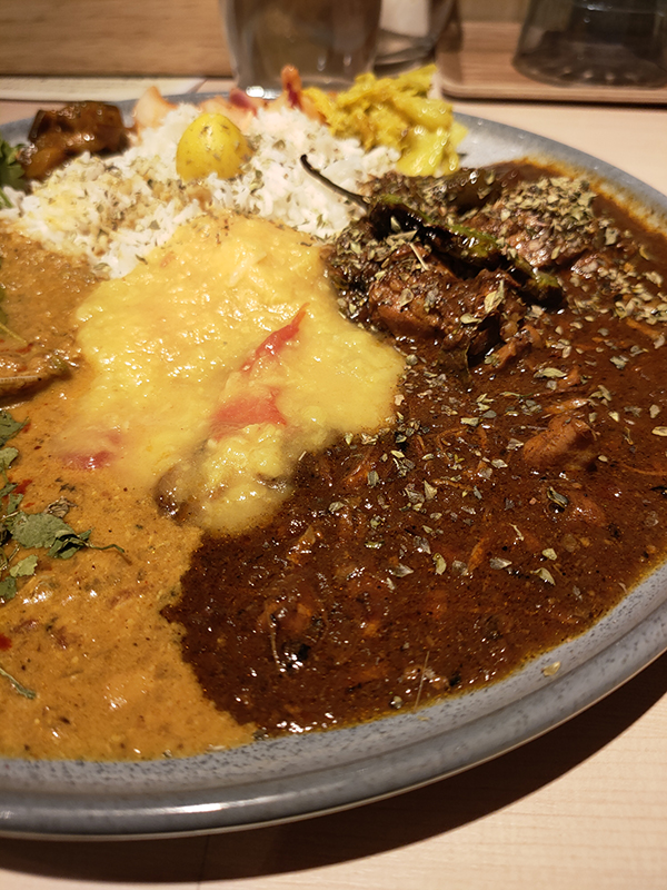 ローストはチキンをローストしているのではなく、スパイスをローストしているカレーで、グロープをよく効かせたスパイスの配合でスパイシーな香りの中にもほろ苦さが感じられる。