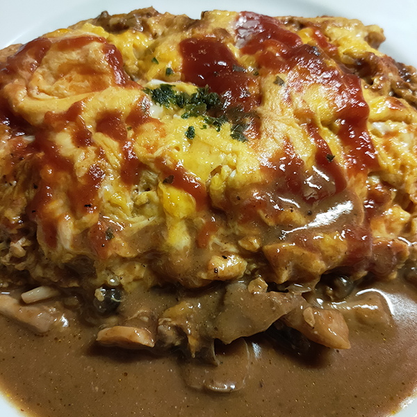 敢えてオムライスの中をケチャップライスにせずにドライカレーにしているところが面白い。