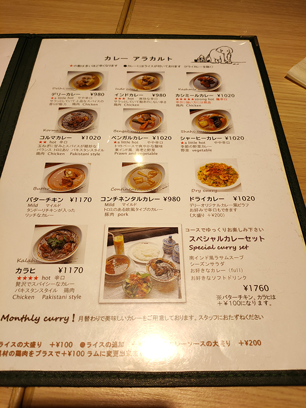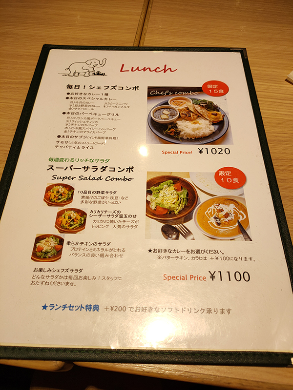 お好みのカレー1種類に、日替わりのカレー、日替わりのバーベキューグリル、サブジ、サモサ、チャパティ、ライスが付いて1,020円という内容。これだけのコストパフォーマンスなので10食限定である。聞いてみると既に品切れとのこと。これ目当てで早くから席が埋まってしまうのだと納得した。