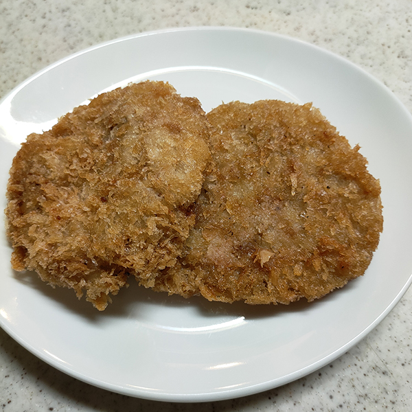 メンチカツは揚げたてだったせいかまだ油が十分に切れていない状態で、衣が油をいっぱい吸い込んでいたが、クッキングペーパーで包んで油を吸わせ、温風調理器で温めて油を少し飛ばしてやると、さほど気にはならないレベルに。