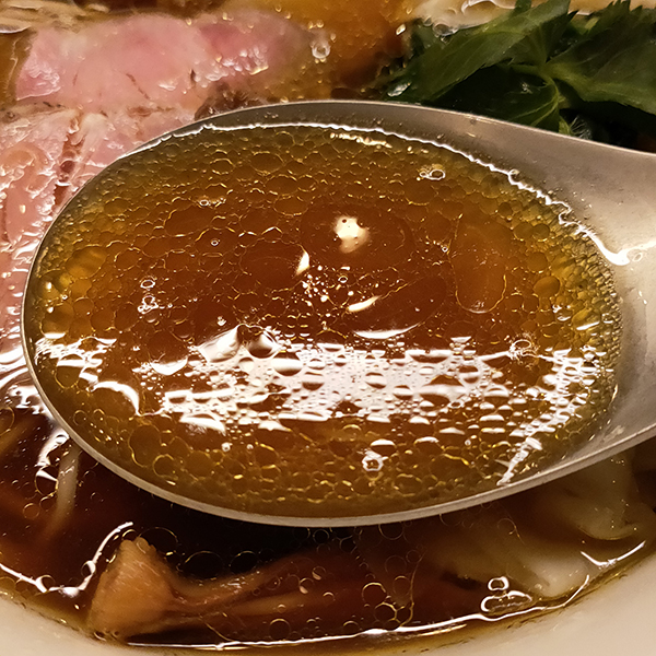 まずはスープを頂く。醤油の色はやや薄め。浮いている油は多い。