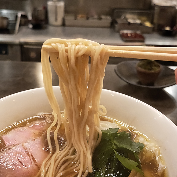 中細ストレート麺は小麦の旨味があり、スープともよく絡む。