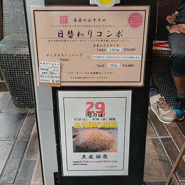 待っている間、ソーシャルディスタンスが保たれた外の椅子で貼り紙を眺めていると、たまたま29、30日はニクの日でハンバーグの肉が増量される特別日だったようだ。