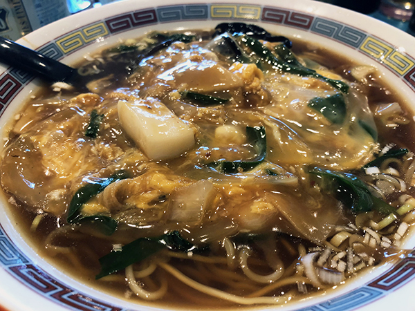 スープは醤油がベースとなり、その上にあんかけの炒め物系が乗る構図だ。