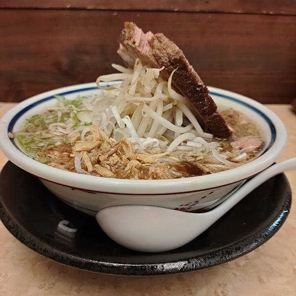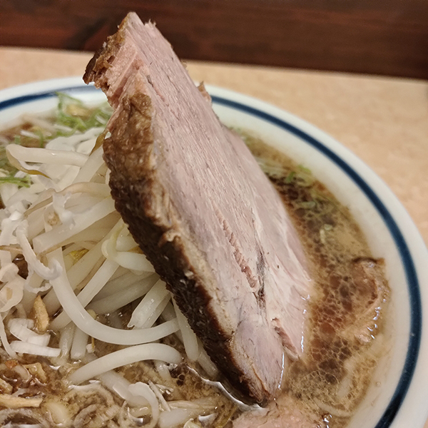中央にこんもりと盛られたもやしに分厚いチャーシューが寄り掛かる豪快なスタイル。
