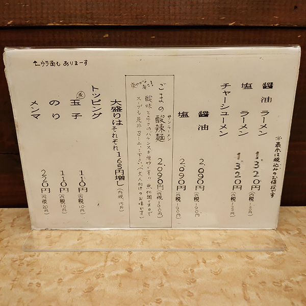 ラーメンは醤油と塩の2種類。これでも1,320円。この他に醤油と塩のチャーシューメンにごまの酸辣湯があるが、これは2,000円超えとかなり高い価格設定である。
