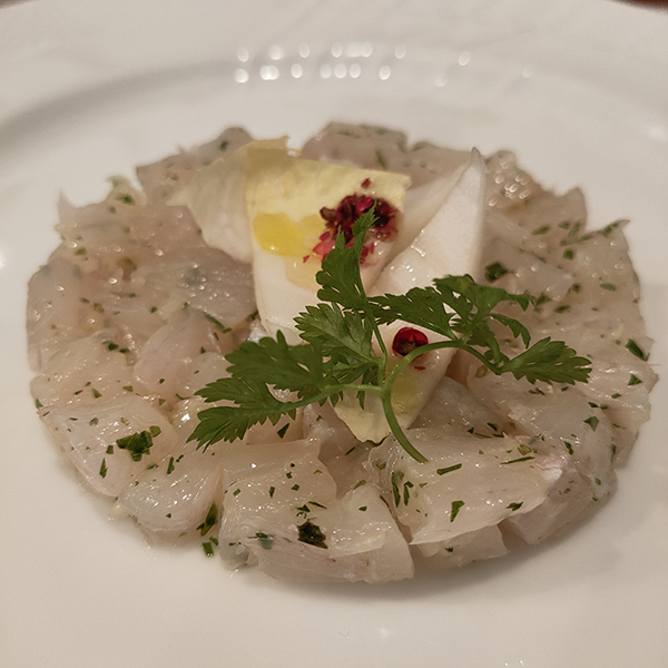 想像を裏切る美しい見た目。丁寧につくられている事が見て取れる。因みに本日の魚はカワハギ。