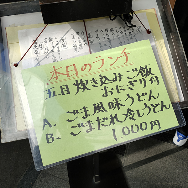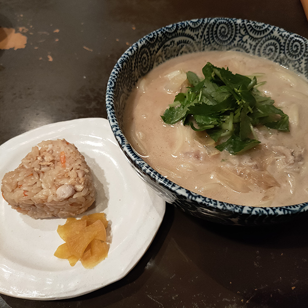 うどんはシンプルに冷たいうどんか温かいうどんの2種類のみ。いずれもごまベースの変わりうどんである。どちらにも五目炊き込みご飯のおにぎりがついてくる。注文したのは温かい方。