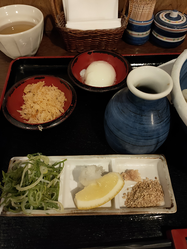 これに温泉玉子を追加。これは別皿で供される。デフォルトでもしょうが、ごま、大根おろし、レモン、ねぎと色々な薬味がつく。